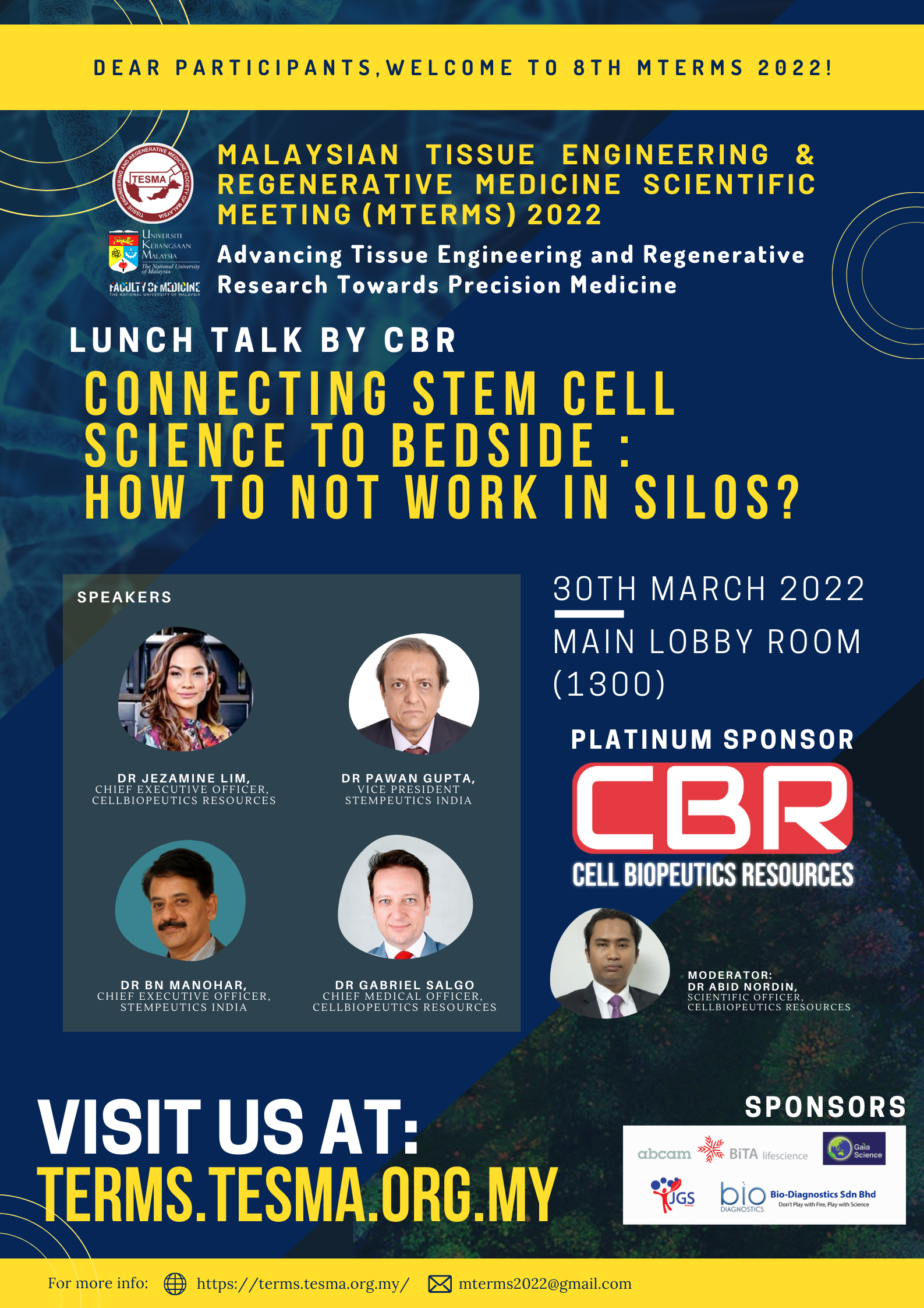 CBR is committed to giving back to the community, especially in the stem cell and tissue engineering fields. CBR has become the platinum sponsor of Malaysian Tissue Engineering & Regenerative Medicine Scientific Meeting (MTERMS) 2022. On 30th – 31st March 2022, “Connecting Stem Cell Science to Bedside: How to not Work in Silos?” was the topic of lunch talk by CBR.